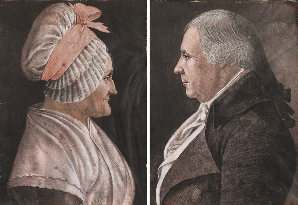 Scuola francese, fine del sec. XVIII "Profilo di gentiluomo dai capelli bianchi" e "Profilo di gentildonna con grande cuffia" coppia di pastelli colorati su carta applicata su cartone pressato (cm 36,5x26) In cornici (difetti)