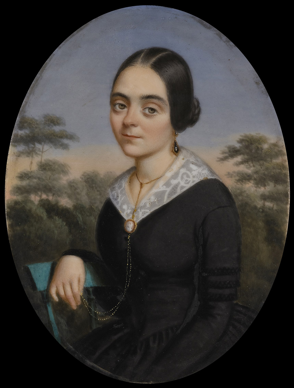 Master of the 19th century "Portrait of a Lady in a Landscape" oval miniature on porcelain (cm 14x11) Dated 1843 to reverse. Framed