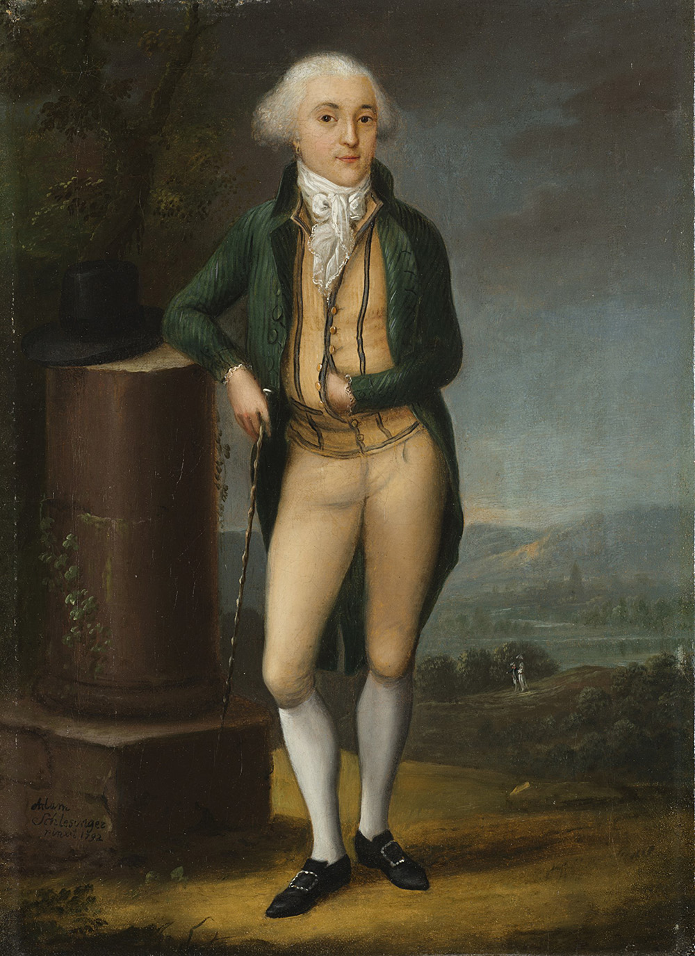 "Ritratto di gentiluomo in piedi in un paesaggio" olio su tela (cm 33,5x23) Firmato e datato 1792 in basso a sinistra. In cornice in legno dorato (difetti)