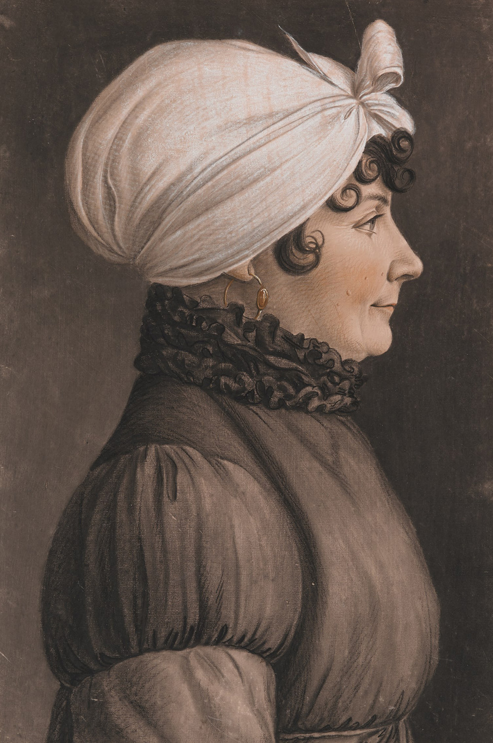 French master of the late 18th/early 19th century "Profile of a Lady" coloured pastel on paper (cm 36x24) Attributed to Etienne Bouchardy to reverse. Framed (defects)