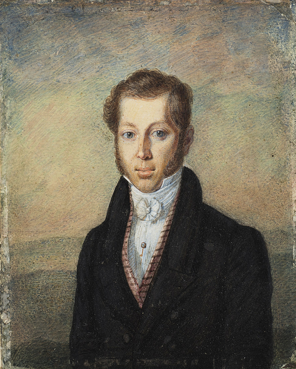 School of the first half of the 19th century "Portrait of a Young Man in a landscape" watercolour on paper (cm 14x11) Framed (restorations)