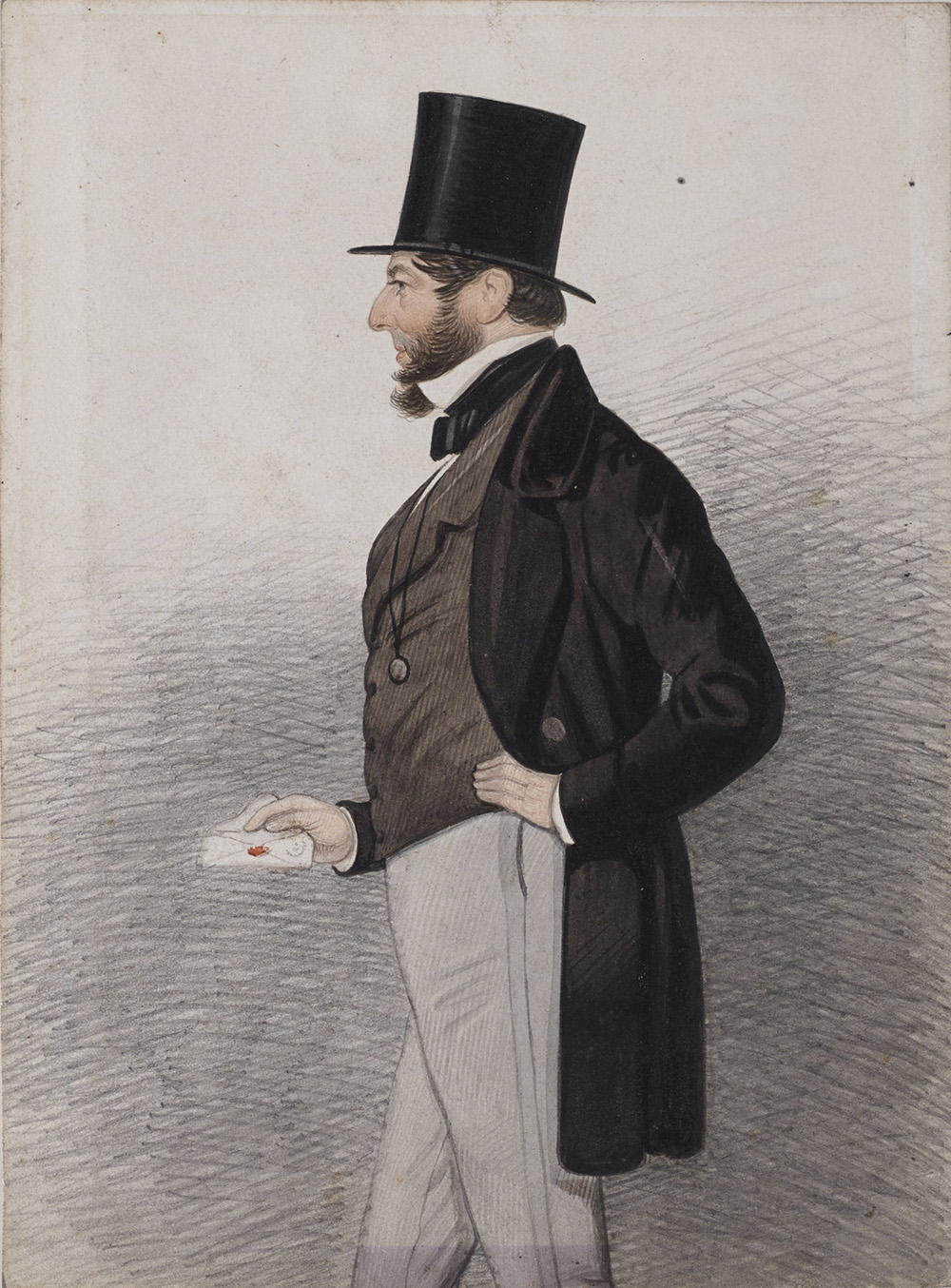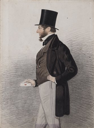 Richard Dighton (London 1795 - 1880) "Profile portrait of a gentleman with top hat" pencil and watercolour on paper (cm 17,5x13) Inscribed on the passepartout.