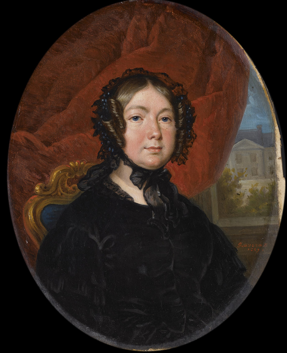 Vincent Nicolas Raverat (Moutiers-Saint-Jean 1801 - Paris 1865) "Portrait of a lady at a window" oil on oval canvas applied on cardboard (cm 23.5x18) Signed and dated 1849 lower right. Framed