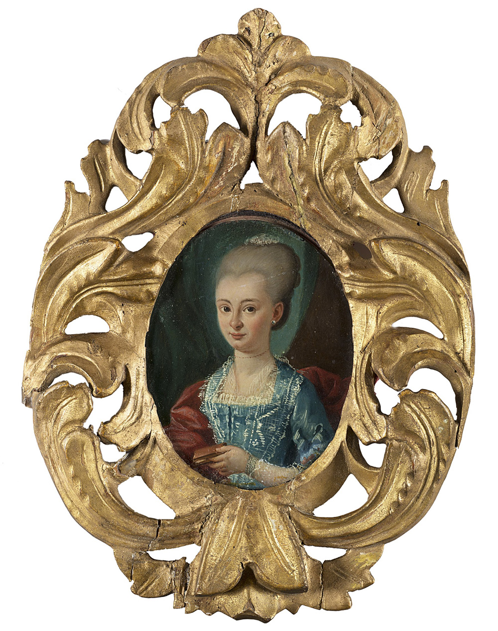 Scuola del sec. XVIII "Ritratto di gentildonna con libro" olio su rame ovale (cm 13x10) In cornice antica in legno intagliato, traforato e dorato (difetti)