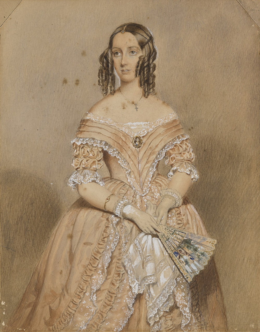 School of the 19th century "Portrait of a lady wearing a pink and lace dress" mixed technique on paper (cm 24.5x19.5) Framed (defects and restorations)