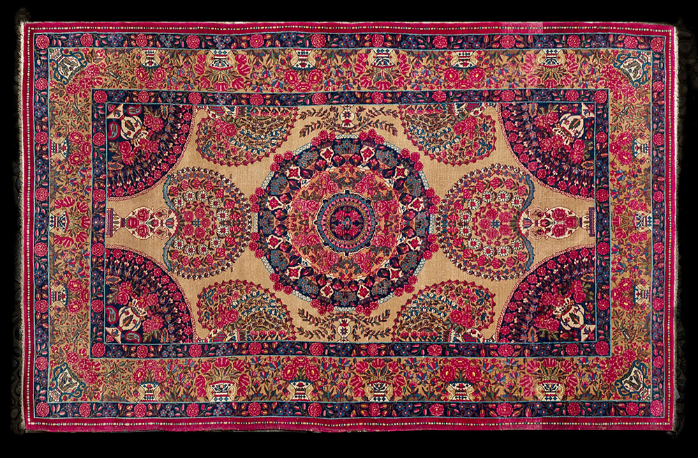 Tappeto Dorosh, Persia secolo XX. Disegno a medaglione e vasi con mazzi di rose su fondo cammello (cm 217x144) (difetti) -EN A Dorosh carpet, Persia, 20th century (cm 217x144) (defects)
