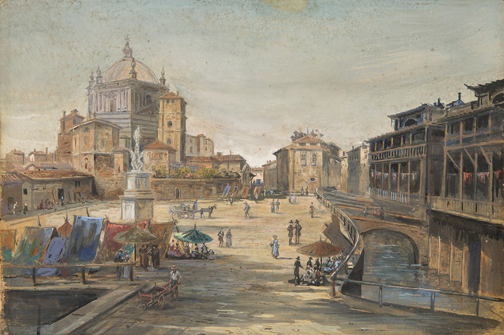 Ignoto "Mercato vicino al Naviglio di San Lorenzo" tecnica mista su carta (cm...