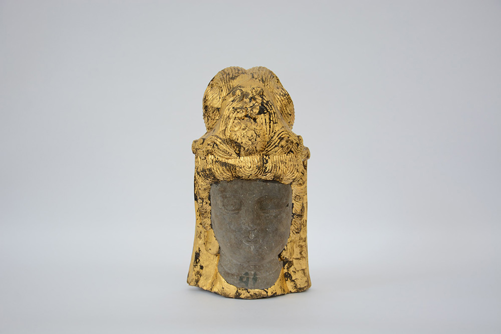 Testa di divinità in pietra decorata a foglie d'oro (h cm 45) (difetti)