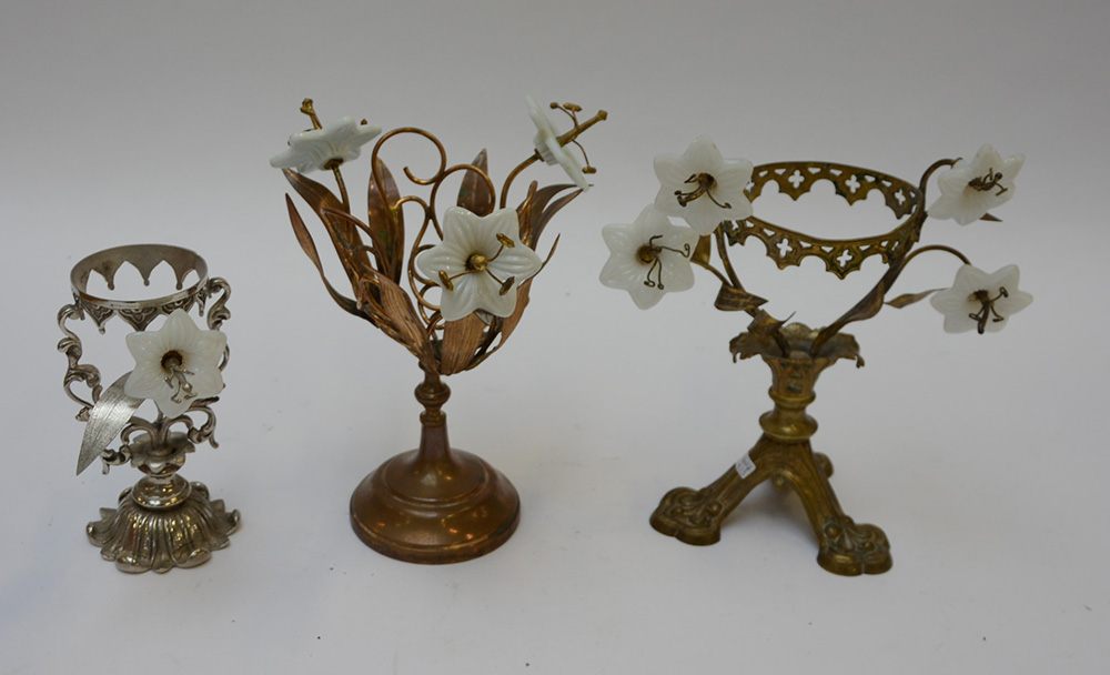 Lotto composto da tre basi in metallo decorate con fiori in vetro (difetti)