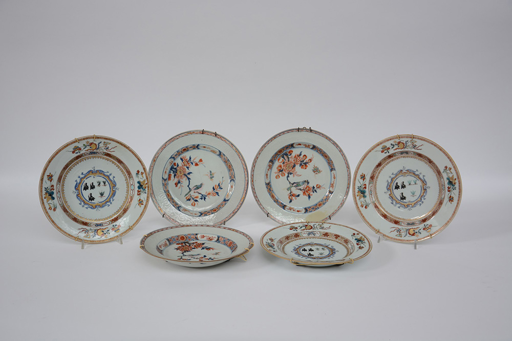 Compagnia delle indie. Lotto composto da tre piatti a decoro Imari e tre piatti con decoro policromo e oro. Con etichetta Antichità Subert Milano (difetti e restauri) Cina, sec. XVIII (d. 22 cm.)
