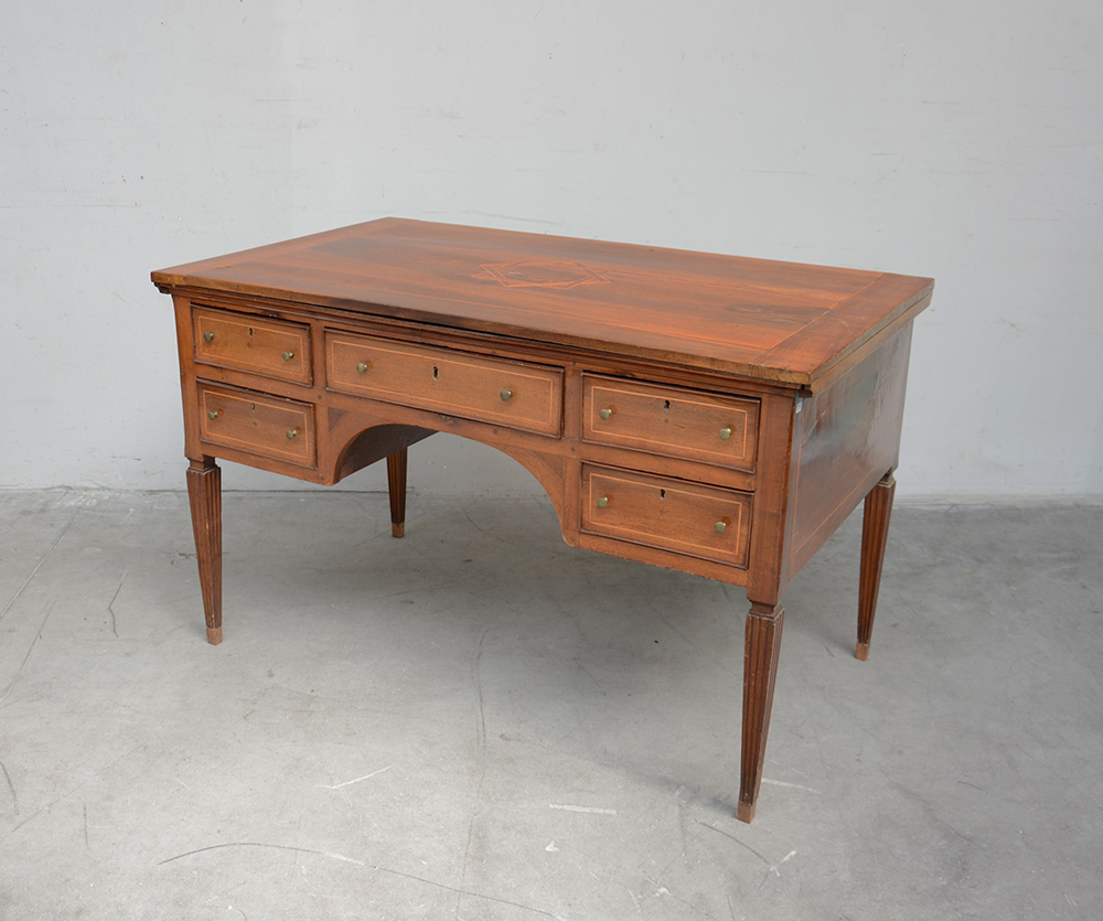 Scrittoio in noce con filettatura in acero, a cinque cassetti e gambe rastremate (cm 130x80x77) (difetti e restauri)