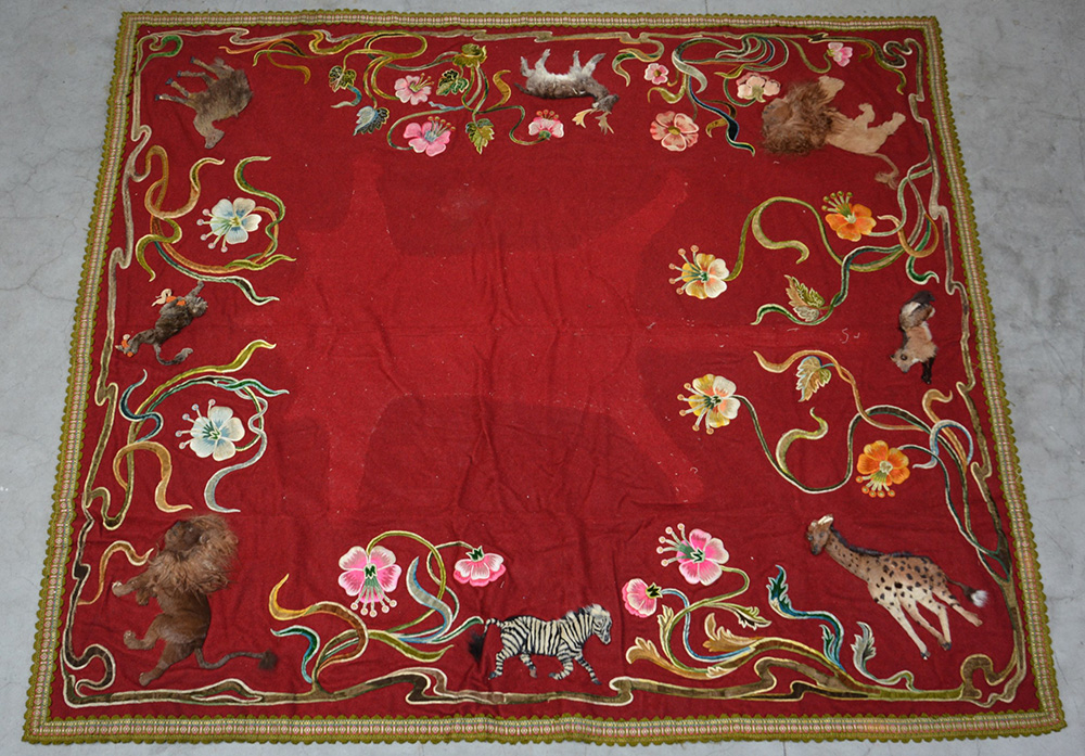 [Tappeti] Copritavolo in panno di lana rosso ricamato con volute fiorite policrome in stile Liberty con figure di vari animali applicate, Austria, sec XIX-XX (cm 282x250) (difetti e mancanze)