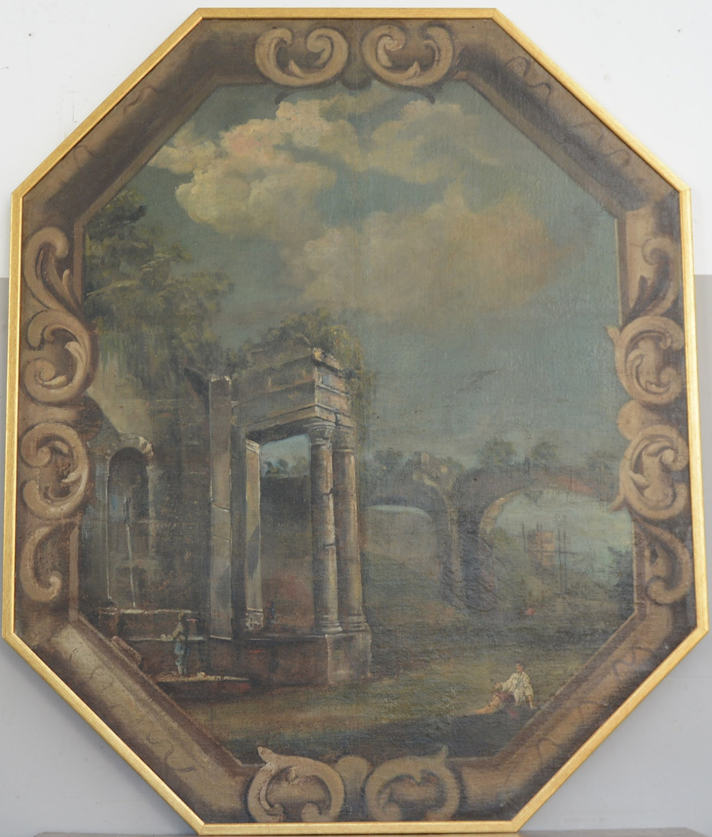 Scuola veneta secolo XVIII "Viandanti tra rovine" olio su tela (cm 160x132) (difetti e restauri) In cornice