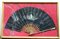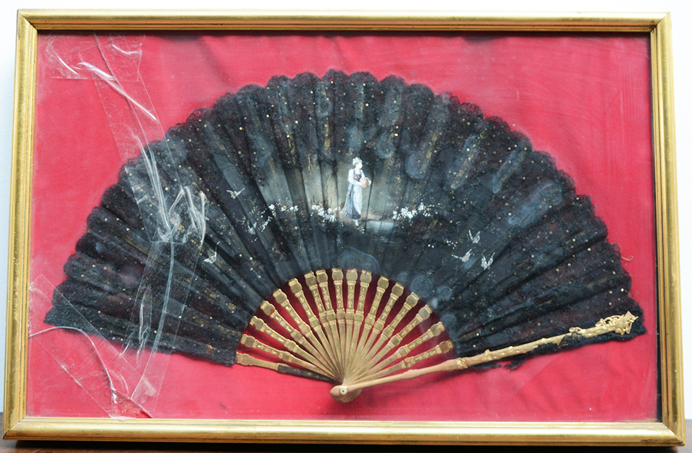 Ventaglio in tessuto decorato con figura di donna in un paesaggio (cm 32x61). In cornice (difetti)