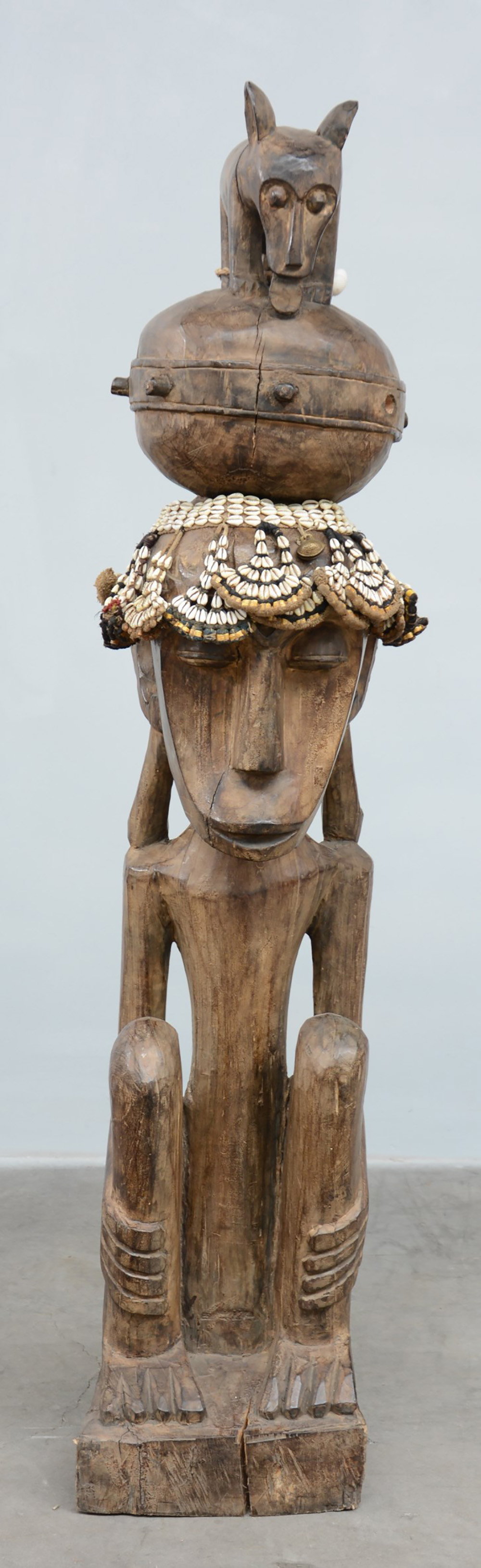 Arte africana. Una grande scultura lignea decorata con collane in conchiglia...