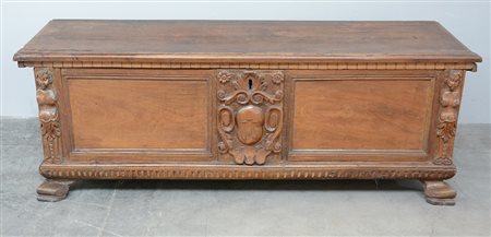 Cassapanca con fronte scolpito al centro da stemma nobiliare entro volute e montanti ad erme, piedi sagomati, sec. XVII (cm 160x57x52)(difetti e restauri)