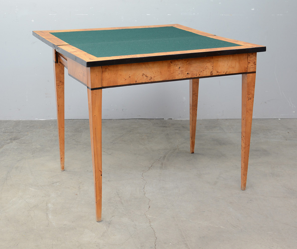 Tavolo da gioco rettangolare lastronato in betulla e profili ebanizzati. Piano apribile celante pannoin stoffa verde. Gambe rastremate (cm 95x82x47)