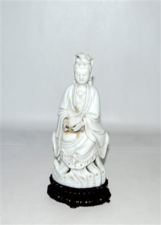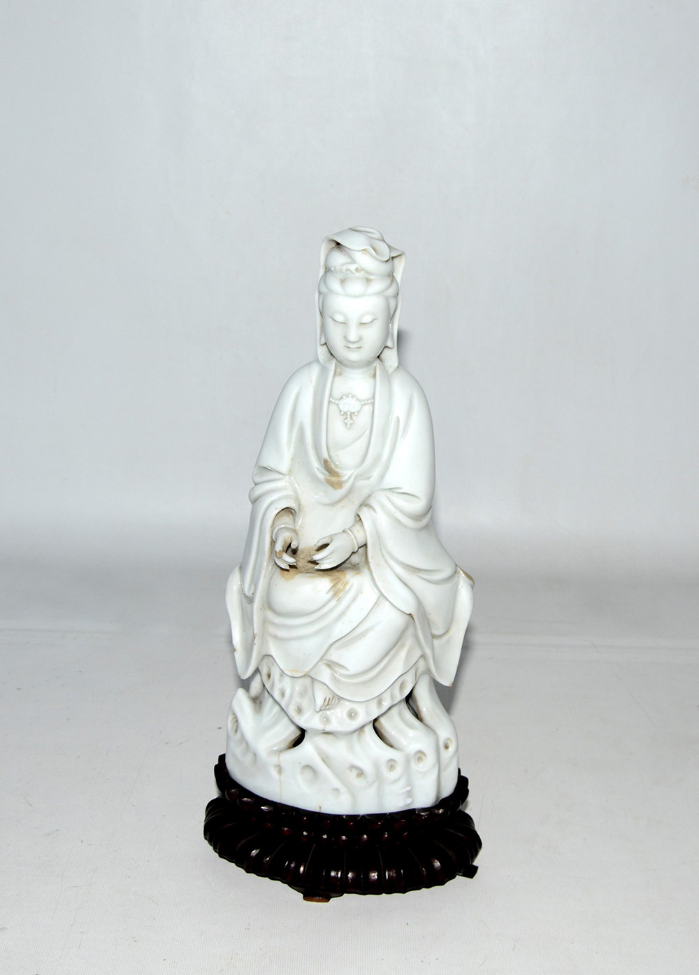 Scultura raffigurante Guanyin seduta su base rocciosa in porcellana Blanc-de-Chine, basamento in legno intagliato. Cina, secolo XX (h cm 31) (difetti, mancanze e restauri)