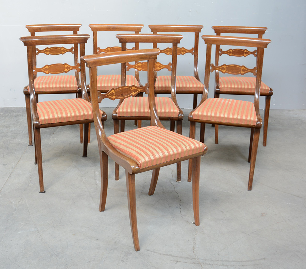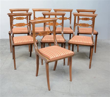 Gruppo di otto sedie con schienale a giorno e cartella sagomata e intarsiata, gambe mosse
