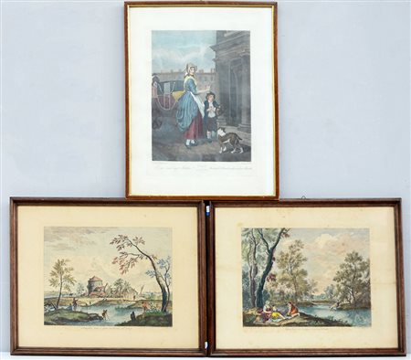 Lotto di tre litografie a colori raffiguranti paesaggi e figure, in cornici...