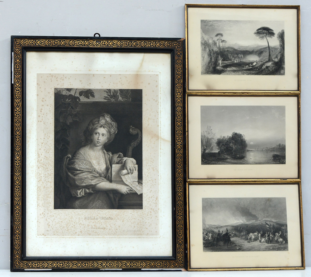 Lotto composto da un incisione del sec. XIX raffigurante sibilla cumana e tre raffiguranti paesaggi e scena di battaglie, in cornici (difetti)