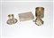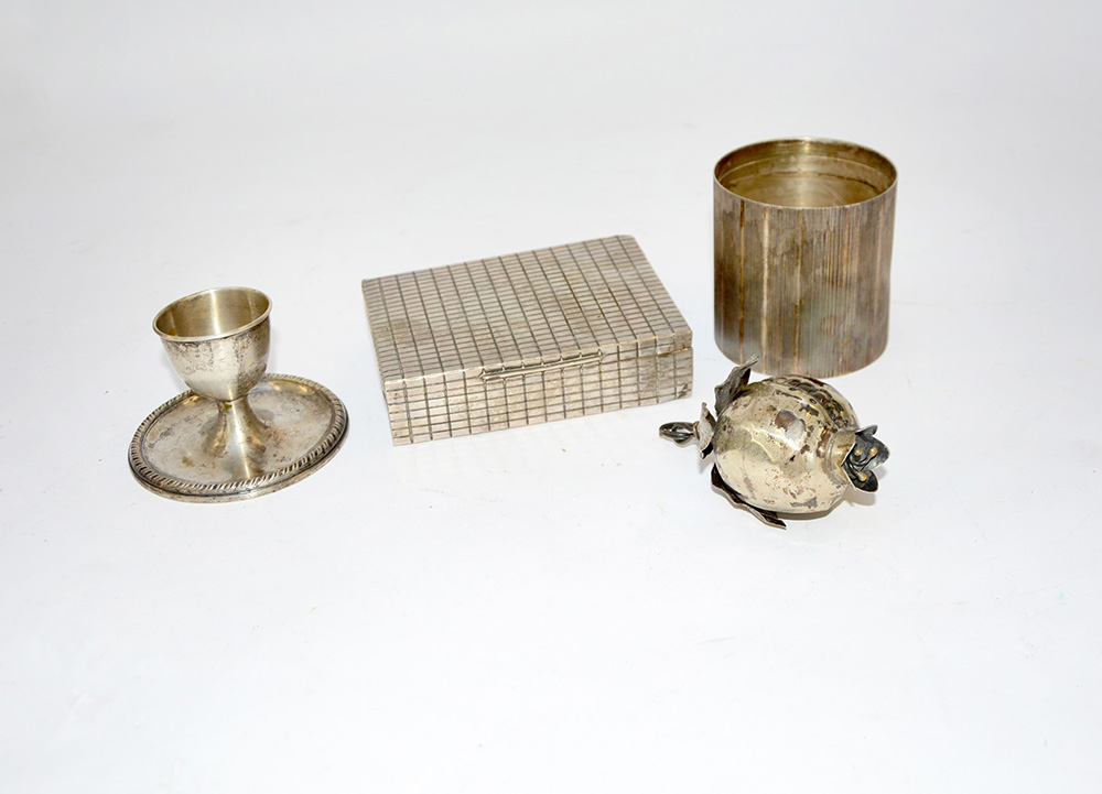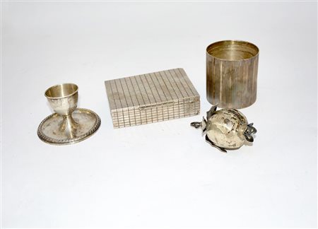 Lotto di quattro oggetti in argento: scatola, portauovo, portamatite e frutto (gr 340 ca.) (difetti)