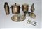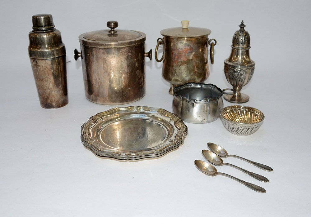 Gruppo di sei piatti, due contenitori, uno shaker, un caster, due ciotole e tre cucchiaini in metallo argentato (difetti)
