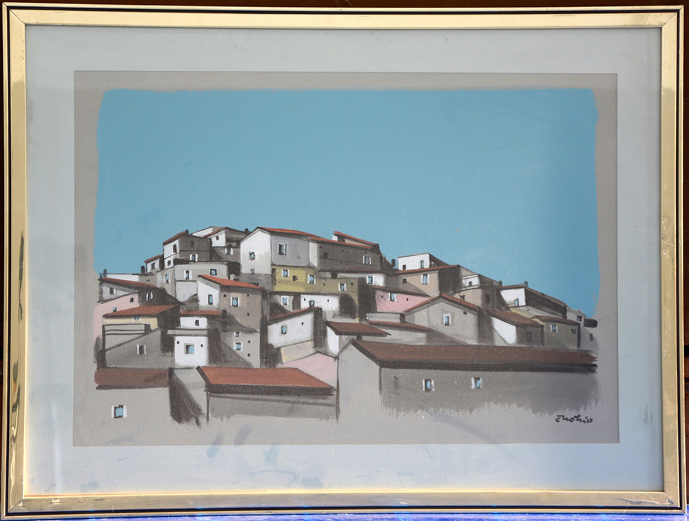 Enotrio Pugliese (Buenos Aires 1920 - Pizzo Calabro 1989) "Case", tecnica mista su cartoncino (cm 45x65), firmato in basso a destra. In cornice (difetti)