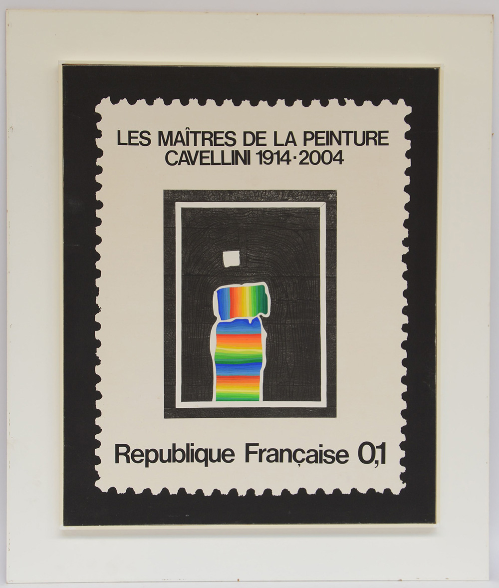Guglielmo Achille Cavellini (Brescia 1914 - 1990) "Les Maitres de la peinture" 1972 della serie Francobolli. Colori acrilici su tela emulsionata (cm 60x49). Firmata e datata al retro. Opera autenticata da Piero Cavellini (inv. Fr. 050).In cornice