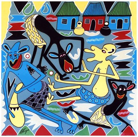 GEORGE LILANGA 1934 - 2005 Subili kwanza tuwaone wakigeana maziwa kwa sili Olio su faesite 61 x 61. Firma in b. a s.; sul verso titolo e data. Autentica galleria Rosenfend, Bad Kissingen su foto. Pubbl.: “George Lilanga” cat. mostra a cura di Silvio Guarasci, Saletta Viviani, Pisa, 10 giugno – 30 luglio 2006, p.45.