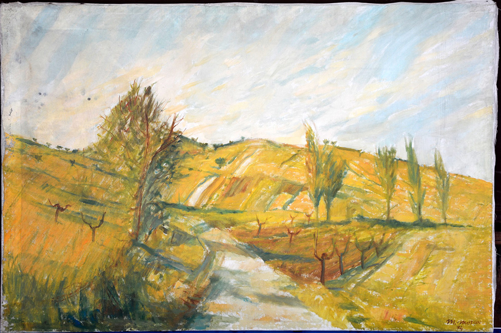 Mosca Mario (Osimo 1940) "Paesaggio marchigiano", 1974, olio su tela (cm 60x90), firmato in basso a destra. Firmato, datato e titolato al retro (difetti)