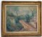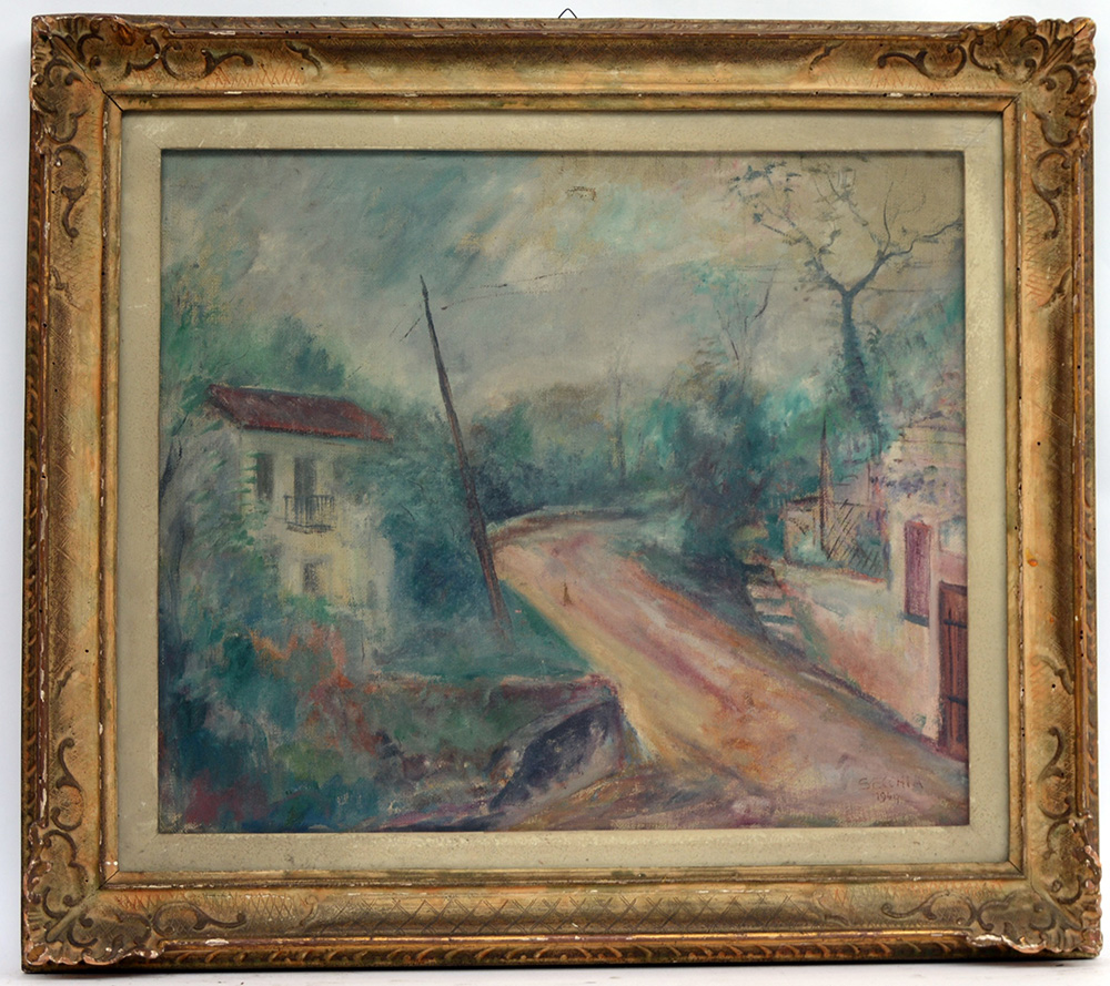 Secchia Amleto (1892) "Scorcio con case e viale" 1949. Olio su tela (cm 50x60) firmato e datato in basso a destra, timbri al retro, in cornice (difetti)