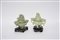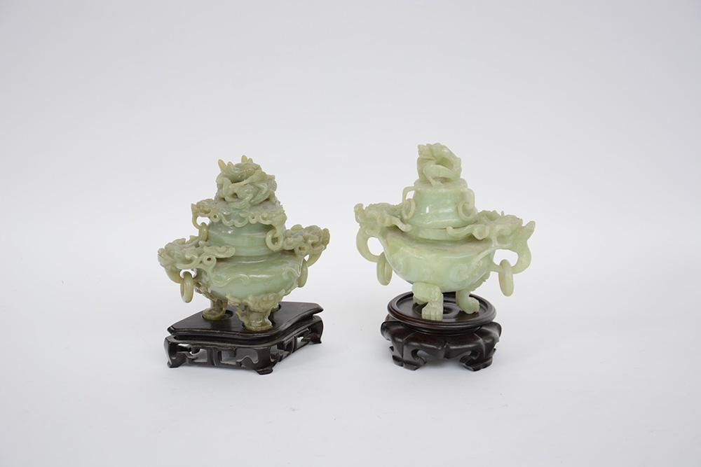 Due incensieri tripodi con coperchio, di misure diverse, in giadeite decorati con draghi, basi in legno (difetti)