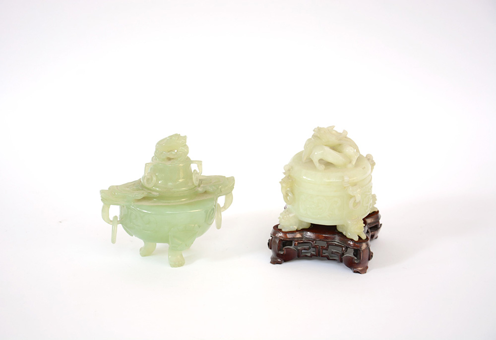 Due incensieri di misure diverse con coperchio in pietra dura, uno con base in legno (difetti) Cina, sec.XX