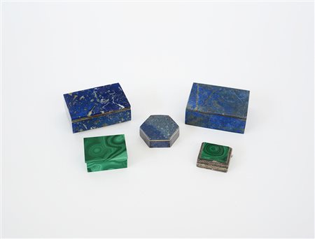 Lotto di cinque scatoline lastronate in lapislazzulo e malachite (misure diverse) (difetti)