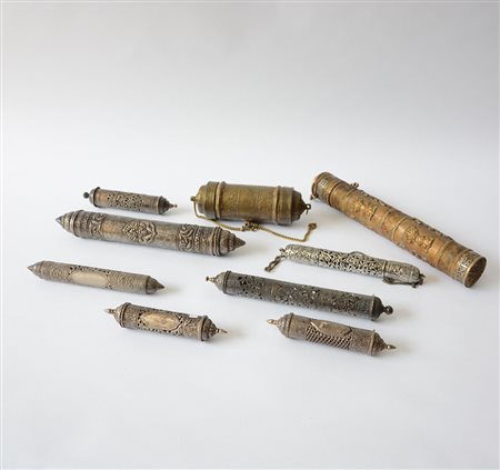Gruppo di nove porta rotoli da preghiera in materiali e decori diversi Manifattura orientale (l.max 33 cm.)