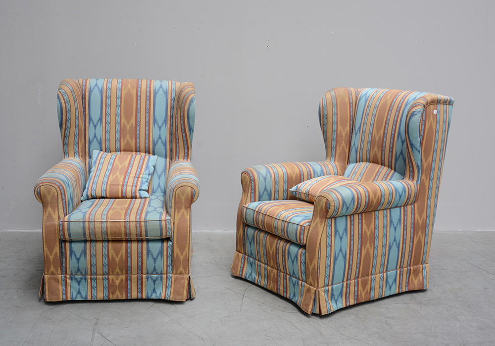 Coppia di poltrone bergère rivestite con tessuto a righe nei toni del celeste ed ocra (difetti)