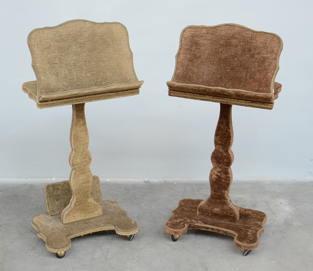 Coppia di leggii in legno sagomato interamente rivestiti in velluto (difetti)