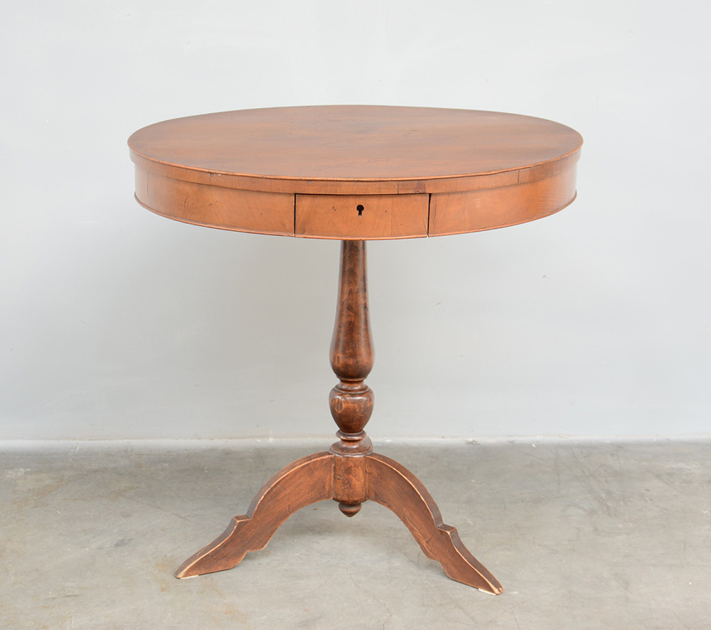 Tavolino da salotto tondo tripode con sostegno a colonna tornita e cassetto nella fascia (d cm 83 x h cm 81) (difetti)