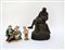 Lotto composto da una scultura in legno intagliato raffigurante una bambina in braccio al padre, firmata all'interno (h cm 34), e due sculture in porcellana con figure del mondo rurale (h max cm 18) (difetti)
