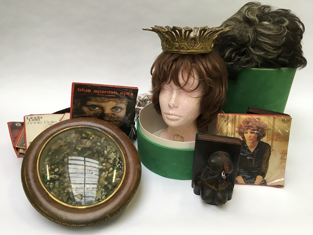 Lotto composto da una teca ovale contenente composizione con fiori, due fermalibri, alcuni scacchi in legno, un fregio in bronzo dorato, una tortiera in peltro, alcuni dischi 45 giri, una cappelliera e due parrucche (difetti)