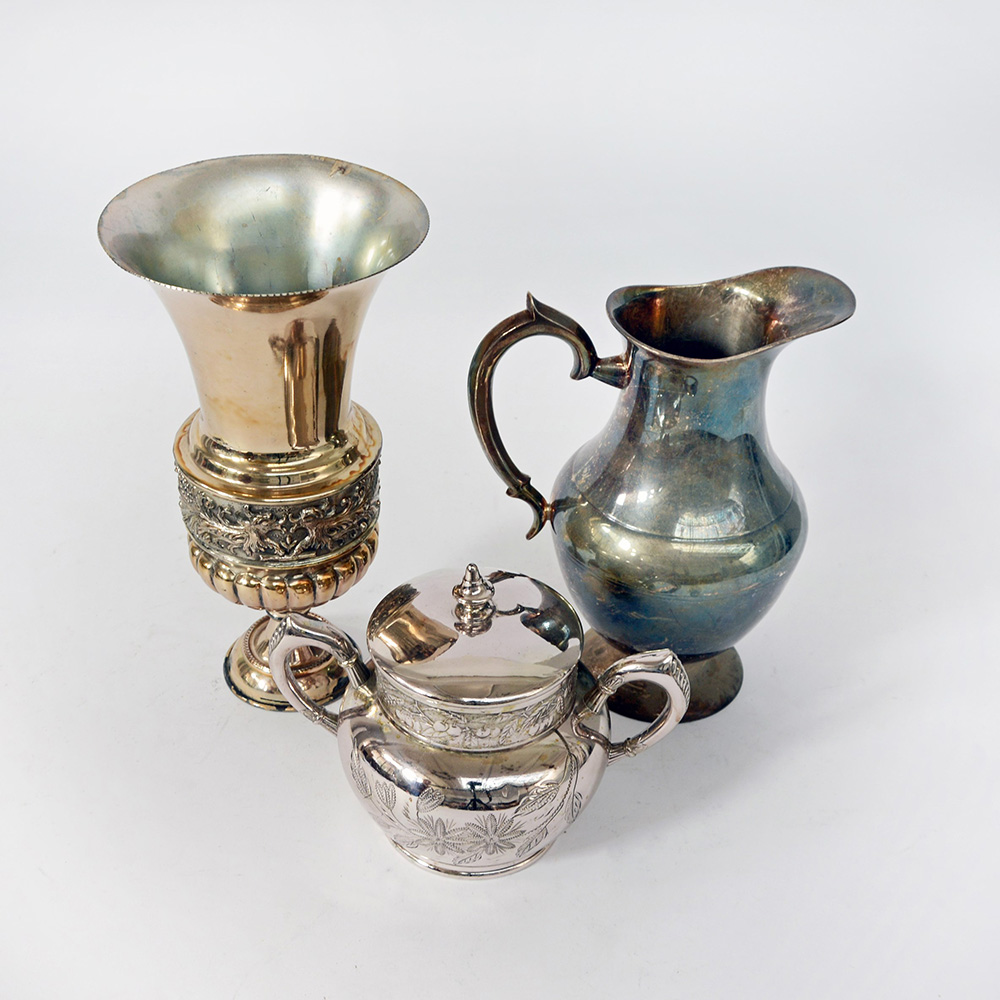 Lotto composto da un versatoio, una zuccheriera biansata e un vaso in metallo argentato (difetti)