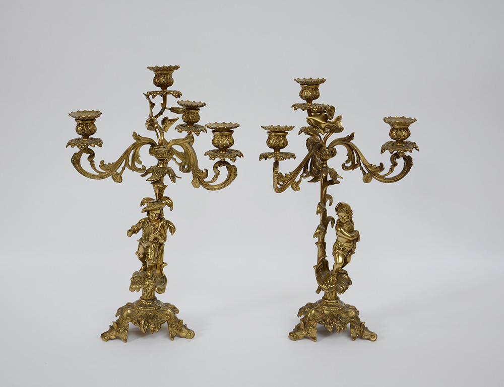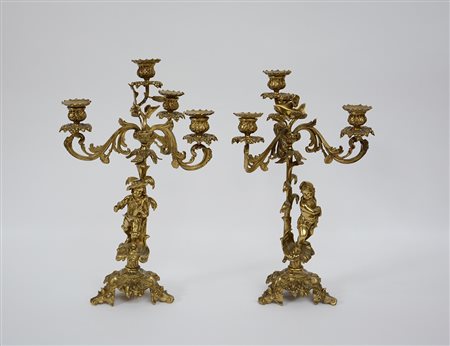 Coppia di candelabri a quattro fiamme in bronzo dorato con decori floreali e figure di pastorelli, secolo XX (h cm 46)
