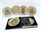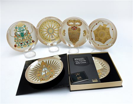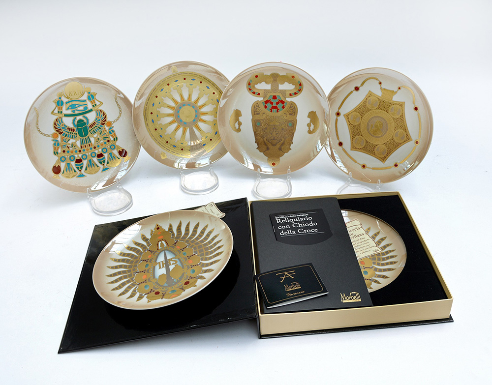 Morbelli Arte, lotto di sei piatti in porcellana incisa decorati a gioiello in policromia di smalti e oro, annate differenti, in custodie originali
