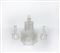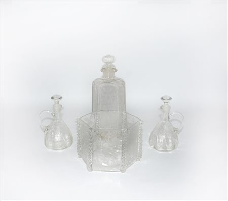 Lotto composto da un centrotavola esagonale, una bottiglia e due oliere in vetro con decorazioni incise a mola (difetti)