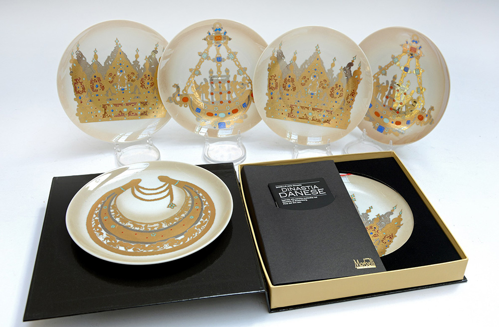 Morbelli Arte, lotto di sei piatti in porcellana incisa decorati a gioiello in policromia di smalti e oro, annate differenti, in custodie originali