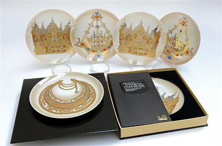 Morbelli Arte, lotto di sei piatti in porcellana incisa decorati a gioiello...