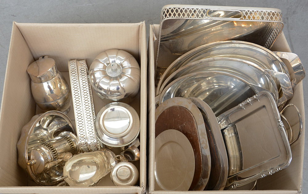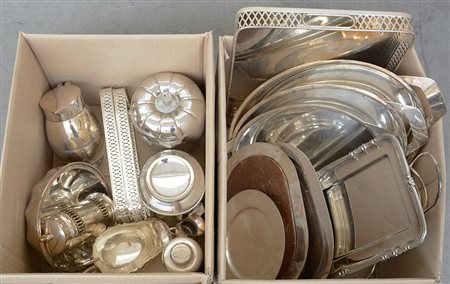 Lotto di due cartoni contenente numerosi oggetti per la tavola in metallo argentato (difetti)
