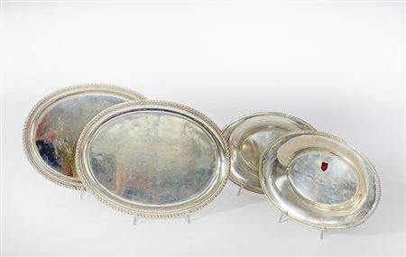 Lotto composto da due vassoio in metallo e due vassoi in argento Miracoli (cm 21,5x15,5; cm 26x20) (gr 420 ca.)