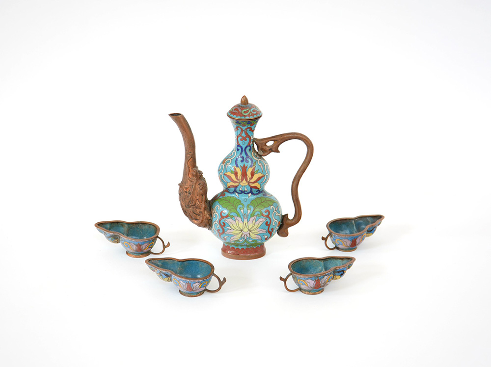 Lotto composto da una teiera e quattro tazzine in rame e in metallo cloisonné a decoro floreale (difetti) Cina, sec. XX